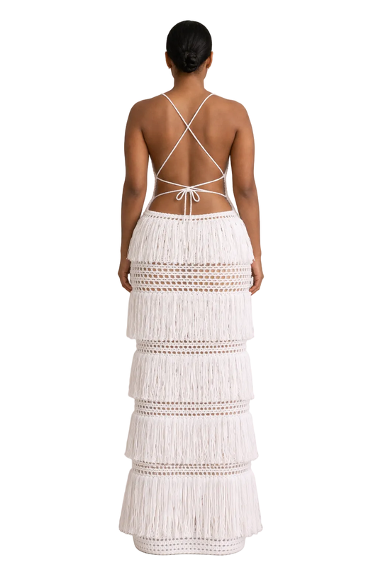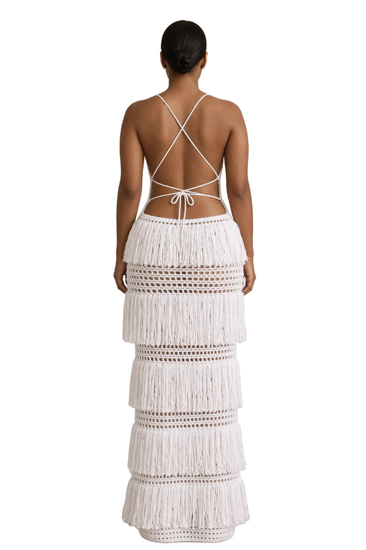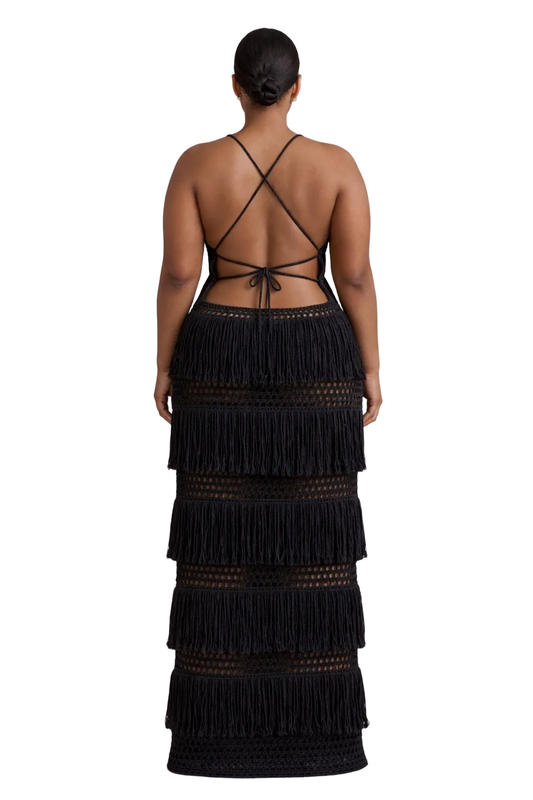 Hand-crocheted with layered fringe and open mesh, Margaux was created to feel striking, feminine, and unforgettable.